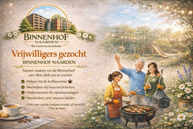 Iedereen helpt mee op zijn eigen manier. Of je nu een uurtje komt helpen met opbouwen of iets lekkers komt brengen of gewoon meehelpt om er een gezellige middag van te maken - alle hulp is welkom. Meld je aan via: info@binnenhofnaarden.nl